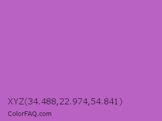 XYZ 34.488,22.974,54.841 Color is a normal magenta color and the nearest color is Fuchsia Pink #c154c1. Hex code #ba61c4 and RGB value is rgb(186,97,196). In RGB color space, this color is composed of 73% red, 38% green, 77% blue, In CMYK color space, this color is composed of 5% cyan, 51% magenta, 0% yellow , 23% black , In HSL color space, this color has a hue angle of 294° , 46% saturation and 57% lightness.