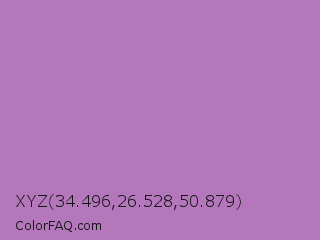 XYZ 34.496,26.528,50.879 Color is a normal magenta color and the nearest color is African Violet #b284be. Hex code #b477bc and RGB value is rgb(180,119,188). In RGB color space, this color is composed of 71% red, 47% green, 74% blue, In CMYK color space, this color is composed of 4% cyan, 37% magenta, 0% yellow , 26% black , In HSL color space, this color has a hue angle of 293° , 34% saturation and 60% lightness.