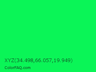 XYZ 34.498,66.057,19.949 Color is a normal green color and the nearest color is Malachite #0bda51. Hex code #0af557 and RGB value is rgb(10,245,87). In RGB color space, this color is composed of 4% red, 96% green, 34% blue, In CMYK color space, this color is composed of 96% cyan, 0% magenta, 64% yellow , 4% black , In HSL color space, this color has a hue angle of 140° , 92% saturation and 50% lightness.