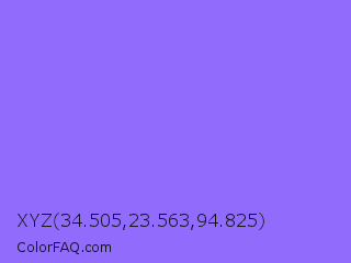 XYZ 34.505,23.563,94.825 Color is a light indigo color and the nearest color is Medium Slate Blue #7b68ee. Hex code #916bfc and RGB value is rgb(145,107,252). In RGB color space, this color is composed of 57% red, 42% green, 99% blue, In CMYK color space, this color is composed of 42% cyan, 58% magenta, 0% yellow , 1% black , In HSL color space, this color has a hue angle of 256° , 96% saturation and 70% lightness.