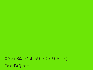 XYZ 34.514,59.795,9.895 Color is a normal green color and the nearest color is Alien Armpit #84de02. Hex code #6ce606 and RGB value is rgb(108,230,6). In RGB color space, this color is composed of 42% red, 90% green, 2% blue, In CMYK color space, this color is composed of 53% cyan, 0% magenta, 97% yellow , 10% black , In HSL color space, this color has a hue angle of 93° , 95% saturation and 46% lightness.