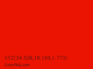 XYZ 34.528,18.169,1.773 Color is a normal red color and the nearest color is KU Crimson #e8000d. Hex code #eb1403 and RGB value is rgb(235,20,3). In RGB color space, this color is composed of 92% red, 8% green, 1% blue, In CMYK color space, this color is composed of 0% cyan, 91% magenta, 99% yellow , 8% black , In HSL color space, this color has a hue angle of 4° , 97% saturation and 47% lightness.