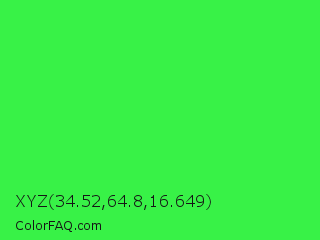 XYZ 34.52,64.8,16.649 Color is a normal green color and the nearest color is Lime Green #32cd32. Hex code #38f247 and RGB value is rgb(56,242,71). In RGB color space, this color is composed of 22% red, 95% green, 28% blue, In CMYK color space, this color is composed of 77% cyan, 0% magenta, 71% yellow , 5% black , In HSL color space, this color has a hue angle of 125° , 88% saturation and 58% lightness.