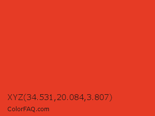 XYZ 34.531,20.084,3.807 Color is a normal red color and the nearest color is CG Red #e03c31. Hex code #e63b25 and RGB value is rgb(230,59,37). In RGB color space, this color is composed of 90% red, 23% green, 15% blue, In CMYK color space, this color is composed of 0% cyan, 74% magenta, 84% yellow , 10% black , In HSL color space, this color has a hue angle of 7° , 79% saturation and 52% lightness.