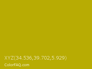 XYZ 34.536,39.702,5.929 Color is a normal yellow color and the nearest color is Buddha Gold #c1a004. Hex code #b8ac03 and RGB value is rgb(184,172,3). In RGB color space, this color is composed of 72% red, 67% green, 1% blue, In CMYK color space, this color is composed of 0% cyan, 7% magenta, 98% yellow , 28% black , In HSL color space, this color has a hue angle of 56° , 97% saturation and 37% lightness.