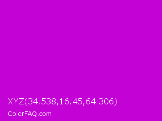 XYZ 34.538,16.45,64.306 Color is a normal magenta color and the nearest color is Deep Magenta #cc00cc. Hex code #c302d5 and RGB value is rgb(195,2,213). In RGB color space, this color is composed of 76% red, 1% green, 84% blue, In CMYK color space, this color is composed of 8% cyan, 99% magenta, 0% yellow , 16% black , In HSL color space, this color has a hue angle of 295° , 98% saturation and 42% lightness.