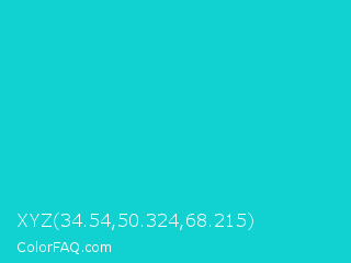 XYZ 34.54,50.324,68.215 Color is a normal cyan color and the nearest color is Dark Turquoise #00ced1. Hex code #11d1d1 and RGB value is rgb(17,209,209). In RGB color space, this color is composed of 7% red, 82% green, 82% blue, In CMYK color space, this color is composed of 92% cyan, 0% magenta, 0% yellow , 18% black , In HSL color space, this color has a hue angle of 180° , 85% saturation and 44% lightness.
