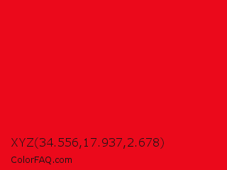XYZ 34.556,17.937,2.678 Color is a normal red color and the nearest color is Vivid Red #f70d1a. Hex code #eb091b and RGB value is rgb(235,9,27). In RGB color space, this color is composed of 92% red, 4% green, 11% blue, In CMYK color space, this color is composed of 0% cyan, 96% magenta, 89% yellow , 8% black , In HSL color space, this color has a hue angle of 355° , 93% saturation and 48% lightness.