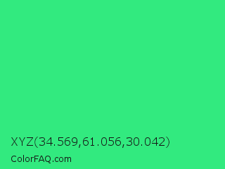 XYZ 34.569,61.056,30.042 Color is a normal green color and the nearest color is UFO Green #3cd070. Hex code #32ea7f and RGB value is rgb(50,234,127). In RGB color space, this color is composed of 20% red, 92% green, 50% blue, In CMYK color space, this color is composed of 79% cyan, 0% magenta, 46% yellow , 8% black , In HSL color space, this color has a hue angle of 145° , 81% saturation and 56% lightness.