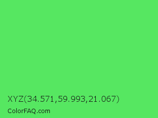 XYZ 34.571,59.993,21.067 Color is a light green color and the nearest color is Screamin Green #66ff66. Hex code #56e761 and RGB value is rgb(86,231,97). In RGB color space, this color is composed of 34% red, 91% green, 38% blue, In CMYK color space, this color is composed of 63% cyan, 0% magenta, 58% yellow , 9% black , In HSL color space, this color has a hue angle of 125° , 75% saturation and 62% lightness.