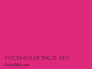 XYZ 34.619,18.596,21.167 Color is a normal rose color and the nearest color is Vivid Cerise #da1d81. Hex code #de297d and RGB value is rgb(222,41,125). In RGB color space, this color is composed of 87% red, 16% green, 49% blue, In CMYK color space, this color is composed of 0% cyan, 82% magenta, 44% yellow , 13% black , In HSL color space, this color has a hue angle of 332° , 73% saturation and 52% lightness.