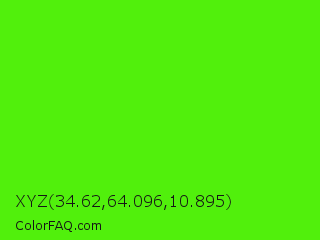 XYZ 34.62,64.096,10.895 Color is a normal green color and the nearest color is Chlorophyll Green #4aff00. Hex code #51f00c and RGB value is rgb(81,240,12). In RGB color space, this color is composed of 32% red, 94% green, 5% blue, In CMYK color space, this color is composed of 66% cyan, 0% magenta, 95% yellow , 6% black , In HSL color space, this color has a hue angle of 102° , 90% saturation and 49% lightness.