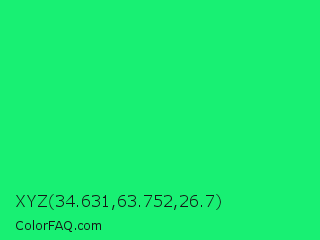 XYZ 34.631,63.752,26.7 Color is a normal green color and the nearest color is Spring Green #00ff7f. Hex code #18f073 and RGB value is rgb(24,240,115). In RGB color space, this color is composed of 9% red, 94% green, 45% blue, In CMYK color space, this color is composed of 90% cyan, 0% magenta, 52% yellow , 6% black , In HSL color space, this color has a hue angle of 145° , 88% saturation and 52% lightness.