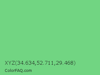 XYZ 34.634,52.711,29.468 Color is a light green color and the nearest color is Pastel Green #77dd77. Hex code #71d582 and RGB value is rgb(113,213,130). In RGB color space, this color is composed of 44% red, 84% green, 51% blue, In CMYK color space, this color is composed of 47% cyan, 0% magenta, 39% yellow , 16% black , In HSL color space, this color has a hue angle of 130° , 54% saturation and 64% lightness.