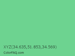 XYZ 34.635,51.853,34.569 Color is a light green color and the nearest color is De York #7ac488. Hex code #6dd390 and RGB value is rgb(109,211,144). In RGB color space, this color is composed of 43% red, 83% green, 56% blue, In CMYK color space, this color is composed of 48% cyan, 0% magenta, 32% yellow , 17% black , In HSL color space, this color has a hue angle of 141° , 54% saturation and 63% lightness.