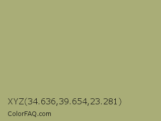 XYZ 34.636,39.654,23.281 Color is a normal yellow color and the nearest color is Green Smoke #a4af6e. Hex code #a9ad77 and RGB value is rgb(169,173,119). In RGB color space, this color is composed of 66% red, 68% green, 47% blue, In CMYK color space, this color is composed of 2% cyan, 0% magenta, 31% yellow , 32% black , In HSL color space, this color has a hue angle of 64° , 25% saturation and 57% lightness.