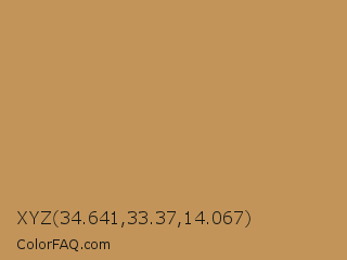 XYZ 34.641,33.37,14.067 Color is a normal orange color and the nearest color is Twine #c2955d. Hex code #c29459 and RGB value is rgb(194,148,89). In RGB color space, this color is composed of 76% red, 58% green, 35% blue, In CMYK color space, this color is composed of 0% cyan, 24% magenta, 54% yellow , 24% black , In HSL color space, this color has a hue angle of 34° , 46% saturation and 55% lightness.
