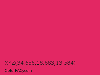 XYZ 34.656,18.683,13.584 Color is a normal rose color and the nearest color is Razzmatazz #e3256b. Hex code #e32763 and RGB value is rgb(227,39,99). In RGB color space, this color is composed of 89% red, 15% green, 39% blue, In CMYK color space, this color is composed of 0% cyan, 83% magenta, 56% yellow , 11% black , In HSL color space, this color has a hue angle of 341° , 77% saturation and 52% lightness.