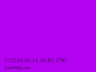 XYZ 34.65,16.06,85.278 Color is a normal purple color and the nearest color is Electric Purple #bf00ff. Hex code #b303f2 and RGB value is rgb(179,3,242). In RGB color space, this color is composed of 70% red, 1% green, 95% blue, In CMYK color space, this color is composed of 26% cyan, 99% magenta, 0% yellow , 5% black , In HSL color space, this color has a hue angle of 284° , 98% saturation and 48% lightness.