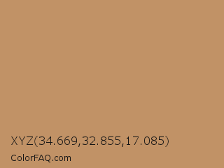 XYZ 34.669,32.855,17.085 Color is a normal orange color and the nearest color is Desert Camel #c19a6b. Hex code #c19266 and RGB value is rgb(193,146,102). In RGB color space, this color is composed of 76% red, 57% green, 40% blue, In CMYK color space, this color is composed of 0% cyan, 24% magenta, 47% yellow , 24% black , In HSL color space, this color has a hue angle of 29° , 42% saturation and 58% lightness.