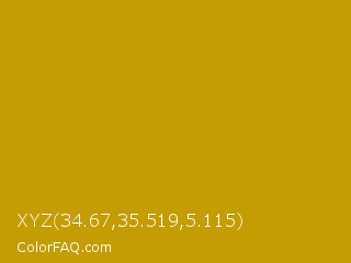 XYZ 34.67,35.519,5.115 Color is a normal yellow color and the nearest color is Buddha Gold #c1a004. Hex code #c49c03 and RGB value is rgb(196,156,3). In RGB color space, this color is composed of 77% red, 61% green, 1% blue, In CMYK color space, this color is composed of 0% cyan, 20% magenta, 98% yellow , 23% black , In HSL color space, this color has a hue angle of 48° , 97% saturation and 39% lightness.