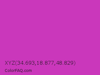 XYZ 34.693,18.877,48.829 Color is a normal magenta color and the nearest color is Steel Pink #cc33cc. Hex code #ca37bb and RGB value is rgb(202,55,187). In RGB color space, this color is composed of 79% red, 22% green, 73% blue, In CMYK color space, this color is composed of 0% cyan, 73% magenta, 7% yellow , 21% black , In HSL color space, this color has a hue angle of 306° , 58% saturation and 50% lightness.