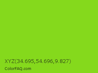 XYZ 34.695,54.696,9.827 Color is a normal green color and the nearest color is Alien Armpit #84de02. Hex code #85d91c and RGB value is rgb(133,217,28). In RGB color space, this color is composed of 52% red, 85% green, 11% blue, In CMYK color space, this color is composed of 39% cyan, 0% magenta, 87% yellow , 15% black , In HSL color space, this color has a hue angle of 87° , 77% saturation and 48% lightness.