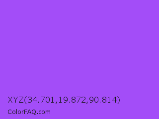 XYZ 34.701,19.872,90.814 Color is a light violet color and the nearest color is Navy Purple #9457eb. Hex code #a34df8 and RGB value is rgb(163,77,248). In RGB color space, this color is composed of 64% red, 30% green, 97% blue, In CMYK color space, this color is composed of 34% cyan, 69% magenta, 0% yellow , 3% black , In HSL color space, this color has a hue angle of 270° , 92% saturation and 64% lightness.