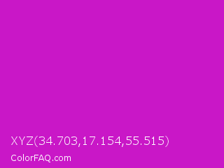 XYZ 34.703,17.154,55.515 Color is a normal magenta color and the nearest color is Deep Magenta #cc00cc. Hex code #c917c7 and RGB value is rgb(201,23,199). In RGB color space, this color is composed of 79% red, 9% green, 78% blue, In CMYK color space, this color is composed of 0% cyan, 89% magenta, 1% yellow , 21% black , In HSL color space, this color has a hue angle of 301° , 79% saturation and 44% lightness.