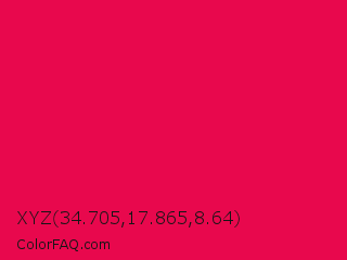 XYZ 34.705,17.865,8.64 Color is a normal rose color and the nearest color is Red Ribbon #ed0a3f. Hex code #e8084d and RGB value is rgb(232,8,77). In RGB color space, this color is composed of 91% red, 3% green, 30% blue, In CMYK color space, this color is composed of 0% cyan, 97% magenta, 67% yellow , 9% black , In HSL color space, this color has a hue angle of 342° , 93% saturation and 47% lightness.