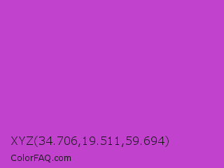 XYZ 34.706,19.511,59.694 Color is a normal magenta color and the nearest color is Steel Pink #cc33cc. Hex code #c042cd and RGB value is rgb(192,66,205). In RGB color space, this color is composed of 75% red, 26% green, 80% blue, In CMYK color space, this color is composed of 6% cyan, 68% magenta, 0% yellow , 20% black , In HSL color space, this color has a hue angle of 294° , 58% saturation and 53% lightness.