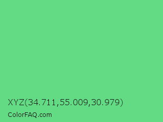 XYZ 34.711,55.009,30.979 Color is a light green color and the nearest color is Very Light Malachite Green #64e986. Hex code #63db85 and RGB value is rgb(99,219,133). In RGB color space, this color is composed of 39% red, 86% green, 52% blue, In CMYK color space, this color is composed of 55% cyan, 0% magenta, 39% yellow , 14% black , In HSL color space, this color has a hue angle of 137° , 63% saturation and 62% lightness.