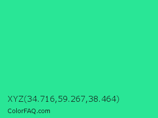 XYZ 34.716,59.267,38.464 Color is a normal green color and the nearest color is Shamrock #33cc99. Hex code #29e696 and RGB value is rgb(41,230,150). In RGB color space, this color is composed of 16% red, 90% green, 59% blue, In CMYK color space, this color is composed of 82% cyan, 0% magenta, 35% yellow , 10% black , In HSL color space, this color has a hue angle of 155° , 79% saturation and 53% lightness.