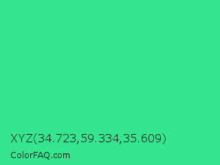 XYZ 34.723,59.334,35.609 Color is a normal green color and the nearest color is Shamrock #33cc99. Hex code #35e68f and RGB value is rgb(53,230,143). In RGB color space, this color is composed of 21% red, 90% green, 56% blue, In CMYK color space, this color is composed of 77% cyan, 0% magenta, 38% yellow , 10% black , In HSL color space, this color has a hue angle of 151° , 78% saturation and 55% lightness.