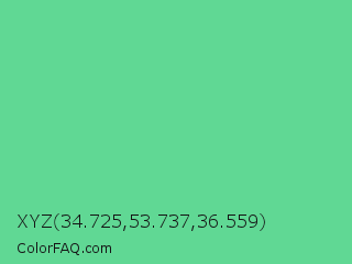 XYZ 34.725,53.737,36.559 Color is a light green color and the nearest color is Very Light Malachite Green #64e986. Hex code #60d894 and RGB value is rgb(96,216,148). In RGB color space, this color is composed of 38% red, 85% green, 58% blue, In CMYK color space, this color is composed of 56% cyan, 0% magenta, 31% yellow , 15% black , In HSL color space, this color has a hue angle of 146° , 61% saturation and 61% lightness.