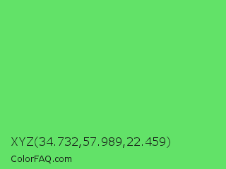 XYZ 34.732,57.989,22.459 Color is a light green color and the nearest color is Pastel Green #77dd77. Hex code #62e268 and RGB value is rgb(98,226,104). In RGB color space, this color is composed of 38% red, 89% green, 41% blue, In CMYK color space, this color is composed of 57% cyan, 0% magenta, 54% yellow , 11% black , In HSL color space, this color has a hue angle of 123° , 69% saturation and 64% lightness.