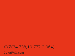 XYZ 34.738,19.777,2.964 Color is a normal red color and the nearest color is Vermilion #d9381e. Hex code #e8351a and RGB value is rgb(232,53,26). In RGB color space, this color is composed of 91% red, 21% green, 10% blue, In CMYK color space, this color is composed of 0% cyan, 77% magenta, 89% yellow , 9% black , In HSL color space, this color has a hue angle of 8° , 82% saturation and 51% lightness.