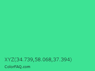 XYZ 34.739,58.068,37.394 Color is a normal green color and the nearest color is Eucalyptus #44d7a8. Hex code #3de394 and RGB value is rgb(61,227,148). In RGB color space, this color is composed of 24% red, 89% green, 58% blue, In CMYK color space, this color is composed of 73% cyan, 0% magenta, 35% yellow , 11% black , In HSL color space, this color has a hue angle of 151° , 75% saturation and 56% lightness.
