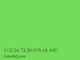 XYZ 34.73,56.079,18.445 Color is a light green color and the nearest color is Mantis #74c365. Hex code #73dd59 and RGB value is rgb(115,221,89). In RGB color space, this color is composed of 45% red, 87% green, 35% blue, In CMYK color space, this color is composed of 48% cyan, 0% magenta, 60% yellow , 13% black , In HSL color space, this color has a hue angle of 108° , 66% saturation and 61% lightness.