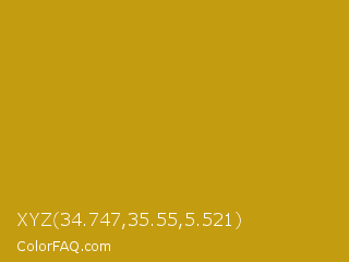 XYZ 34.747,35.55,5.521 Color is a normal yellow color and the nearest color is Pizza #c99415. Hex code #c49c10 and RGB value is rgb(196,156,16). In RGB color space, this color is composed of 77% red, 61% green, 6% blue, In CMYK color space, this color is composed of 0% cyan, 20% magenta, 92% yellow , 23% black , In HSL color space, this color has a hue angle of 47° , 85% saturation and 42% lightness.