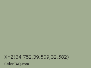 XYZ 34.752,39.509,32.582 Color is a light green color and the nearest color is Locust #a8af8e. Hex code #a1ad91 and RGB value is rgb(161,173,145). In RGB color space, this color is composed of 63% red, 68% green, 57% blue, In CMYK color space, this color is composed of 7% cyan, 0% magenta, 16% yellow , 32% black , In HSL color space, this color has a hue angle of 86° , 15% saturation and 62% lightness.