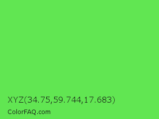 XYZ 34.75,59.744,17.683 Color is a light green color and the nearest color is Screamin Green #66ff66. Hex code #61e652 and RGB value is rgb(97,230,82). In RGB color space, this color is composed of 38% red, 90% green, 32% blue, In CMYK color space, this color is composed of 58% cyan, 0% magenta, 64% yellow , 10% black , In HSL color space, this color has a hue angle of 114° , 75% saturation and 61% lightness.