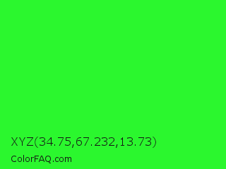XYZ 34.75,67.232,13.73 Color is a normal green color and the nearest color is Neon Green #39ff14. Hex code #2bf72e and RGB value is rgb(43,247,46). In RGB color space, this color is composed of 17% red, 97% green, 18% blue, In CMYK color space, this color is composed of 83% cyan, 0% magenta, 81% yellow , 3% black , In HSL color space, this color has a hue angle of 121° , 93% saturation and 57% lightness.