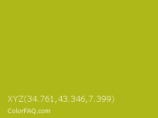 XYZ 34.761,43.346,7.399 Color is a normal yellow color and the nearest color is Acid Green #b0bf1a. Hex code #aeb818 and RGB value is rgb(174,184,24). In RGB color space, this color is composed of 68% red, 72% green, 9% blue, In CMYK color space, this color is composed of 5% cyan, 0% magenta, 87% yellow , 28% black , In HSL color space, this color has a hue angle of 64° , 77% saturation and 41% lightness.