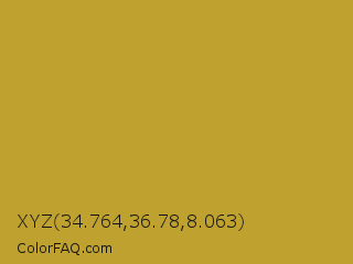 XYZ 34.764,36.78,8.063 Color is a normal yellow color and the nearest color is Hokey Pokey #c8a528. Hex code #bfa130 and RGB value is rgb(191,161,48). In RGB color space, this color is composed of 75% red, 63% green, 19% blue, In CMYK color space, this color is composed of 0% cyan, 16% magenta, 75% yellow , 25% black , In HSL color space, this color has a hue angle of 47° , 60% saturation and 47% lightness.