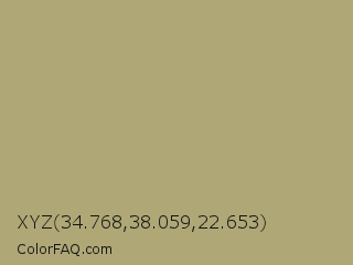 XYZ 34.768,38.059,22.653 Color is a normal yellow color and the nearest color is Mongoose #b5a27f. Hex code #afa776 and RGB value is rgb(175,167,118). In RGB color space, this color is composed of 69% red, 65% green, 46% blue, In CMYK color space, this color is composed of 0% cyan, 5% magenta, 33% yellow , 31% black , In HSL color space, this color has a hue angle of 52° , 26% saturation and 57% lightness.