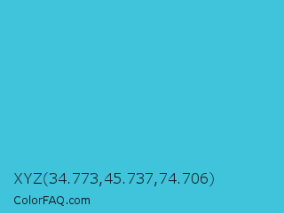 XYZ 34.773,45.737,74.706 Color is a normal cyan color and the nearest color is Sea Serpent #4bc7cf. Hex code #40c4dc and RGB value is rgb(64,196,220). In RGB color space, this color is composed of 25% red, 77% green, 86% blue, In CMYK color space, this color is composed of 71% cyan, 11% magenta, 0% yellow , 14% black , In HSL color space, this color has a hue angle of 189° , 69% saturation and 56% lightness.