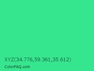 XYZ 34.776,59.361,35.612 Color is a normal green color and the nearest color is Shamrock #33cc99. Hex code #36e68f and RGB value is rgb(54,230,143). In RGB color space, this color is composed of 21% red, 90% green, 56% blue, In CMYK color space, this color is composed of 77% cyan, 0% magenta, 38% yellow , 10% black , In HSL color space, this color has a hue angle of 150° , 78% saturation and 56% lightness.