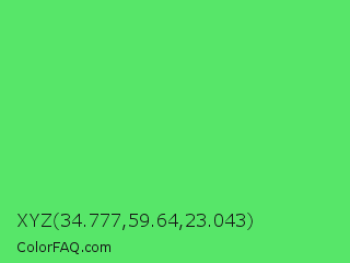 XYZ 34.777,59.64,23.043 Color is a light green color and the nearest color is Screamin Green #66ff66. Hex code #57e669 and RGB value is rgb(87,230,105). In RGB color space, this color is composed of 34% red, 90% green, 41% blue, In CMYK color space, this color is composed of 62% cyan, 0% magenta, 54% yellow , 10% black , In HSL color space, this color has a hue angle of 128° , 74% saturation and 62% lightness.