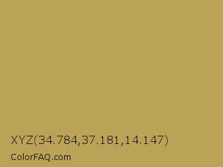 XYZ 34.784,37.181,14.147 Color is a normal yellow color and the nearest color is Husk #b7a458. Hex code #b9a356 and RGB value is rgb(185,163,86). In RGB color space, this color is composed of 73% red, 64% green, 34% blue, In CMYK color space, this color is composed of 0% cyan, 12% magenta, 54% yellow , 27% black , In HSL color space, this color has a hue angle of 47° , 41% saturation and 53% lightness.